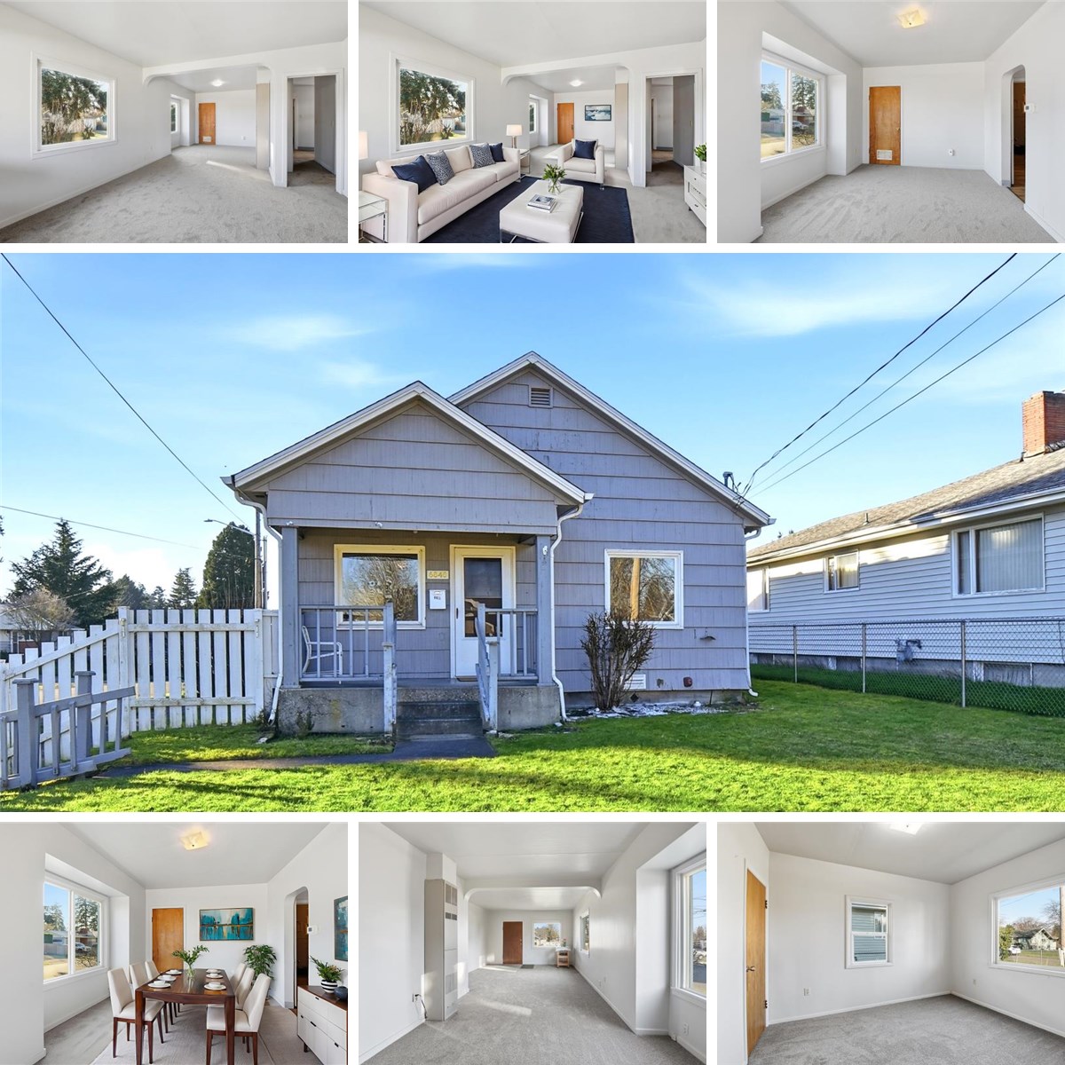 Affordable rambler – One level living! 2 bedrooms, 1 full bath, 1 car garage. New in 2026 = Whole interior repainted, new vinyl and plush carpeting, new stove/range, and Brand New Furnace!! Virtually staged. Property being sold as-is. Upgraded Vinyl windows, Large kitchen with eating area and nice size living room. Laundry room is off the kitchen for your convenience. Lots of storage. Located on an elevated lot off the street, Fully fenced, Level front and back yards with front porch and rear patio deck. Don’t miss the oversized newer 1 car garage with shop and separate power panel! Close to shopping and freeway. Hurry on this one!